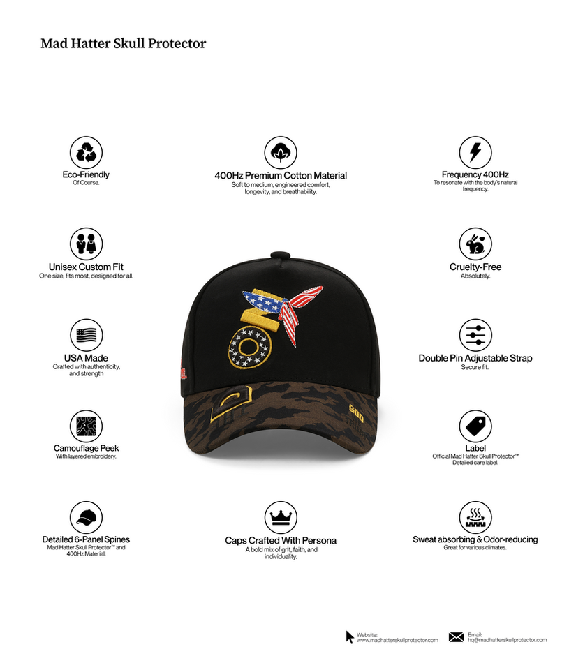 Mad Hatter Skull Protector™ presents The Don Cap, USA built from 400Hz premium Cotton Material, engineered to resonate with your body’s frequency, promoting balance, energy, and alignment; The Don Cap is more than headwear — it’s a statement piece. Featuring bold embroidery across the front, and peek, with an American flag, and motif, a black crown, and rugged black and brown camouflaged peek print, with embroidered, and stitched graphics, and multiple messages woven into the design: “The Don”, “In God We Trust”, and “Hey Baby… Ya Missed”.